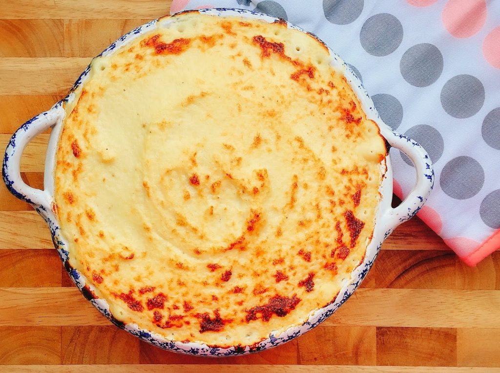 Tálaláskor burgonyapürével, esetleg karfiolpürével és a vele sült savanyú káposztával tálalom. Én karfiol pürét készítettem, szokásos módon készítem el, mint ha burgonyapürét készítenék. De ebben az esetben a sütőbe is szerettem volna még sütni, így kevertem bele,1 gerezd foghagymát és reszelt sajtot is. Addig sütöttem, amíg a teteje el nem kezdet szépen arany barnává sülni.