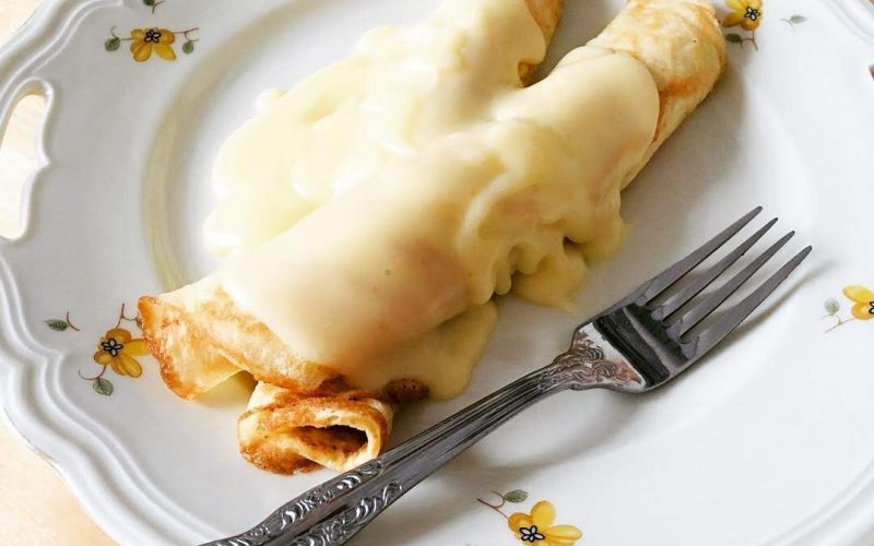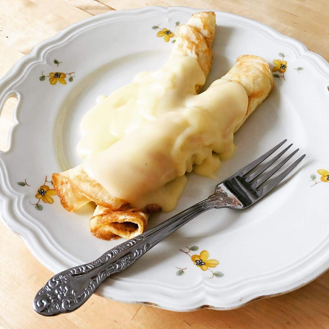 Én fahéjjal és kakaóval töltöttem meg, kókusztejből pedig vaníliás sodót készítettem azzal öntöttem le a palacsintát.