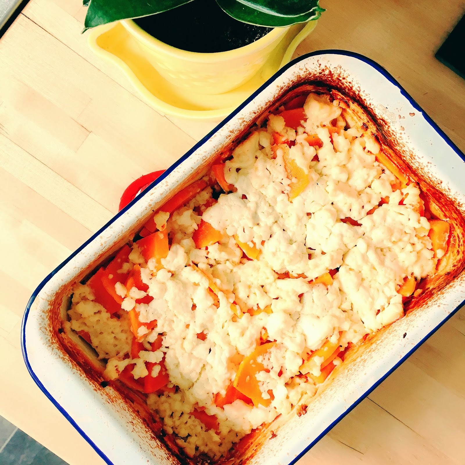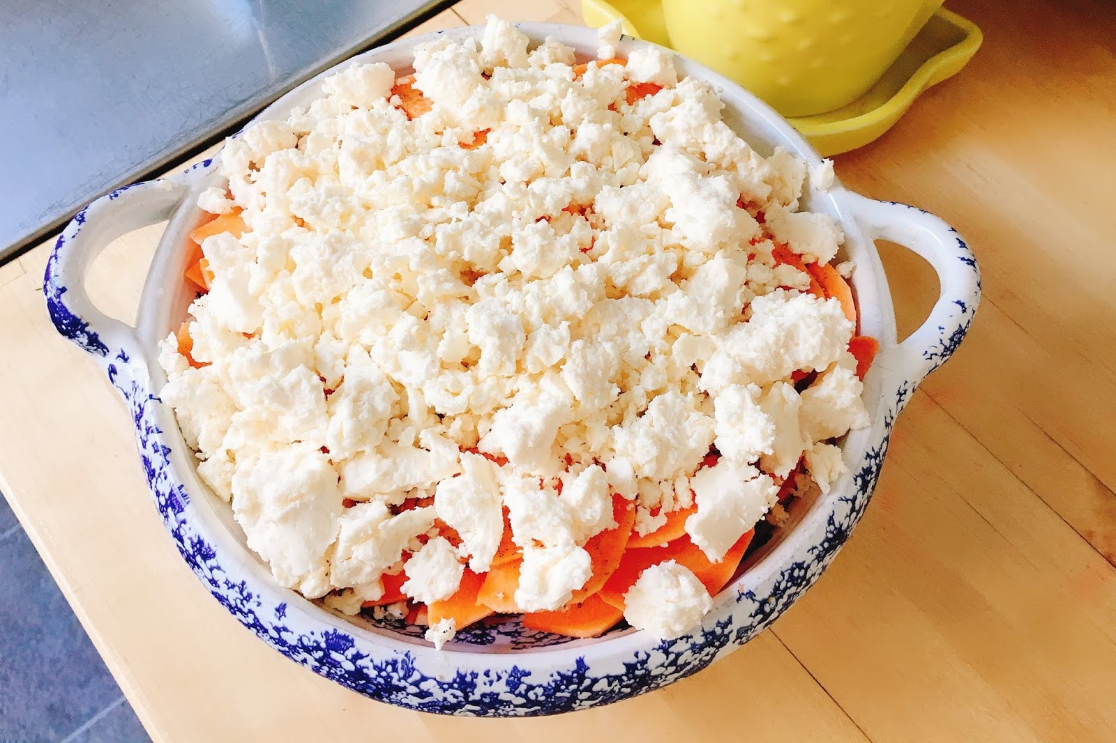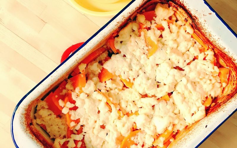 Rá morzsolom az egész feta sajtot és meglocsolom a tejszínnel. Az egész tetejére pár vékony kocka vajat is teszek.