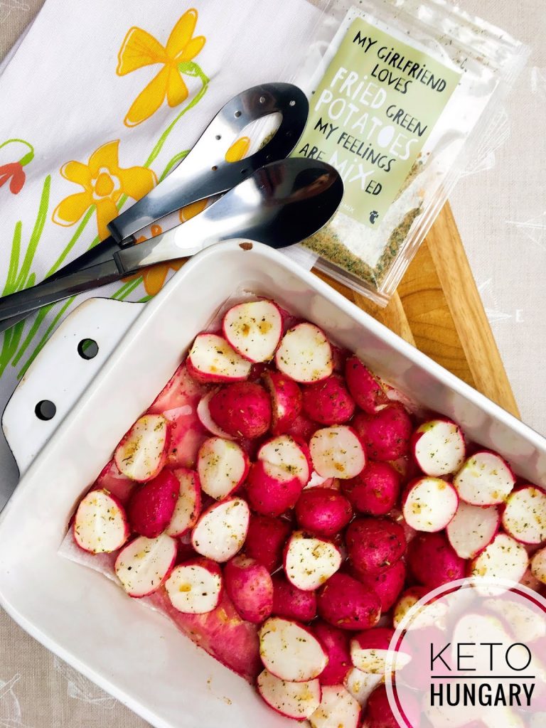 Elkészítése sem bonyolult. 2 csomag retket, megmossunk és kettévágjuk őket. Sózzuk, borsozzuk. Vagy lehet, esetleg akinek van otthon sült krumpli fűszerkeveréke azzal megszórni. Kevés olajat is öntünk rá, és jól összekeverjük az egészet a retekkel.