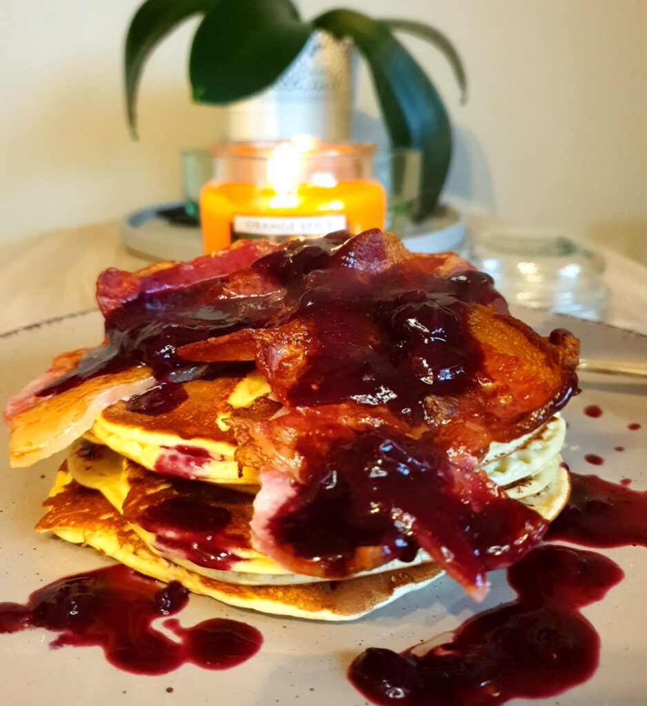 De mi nagyon szeretjük a forró, friss erdei gyümölcsös öntetett hozzá és a bacont.
