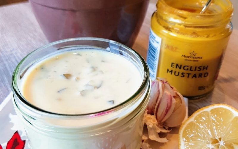 A joghurtot egy keverőtálba tesszük, hozzá adjuk a sót, borsót, zúzott foghagymát, mustárt, juharszirupot és az uborkának a levéből is teszünk bele kb. 3 evőkanálnyit.