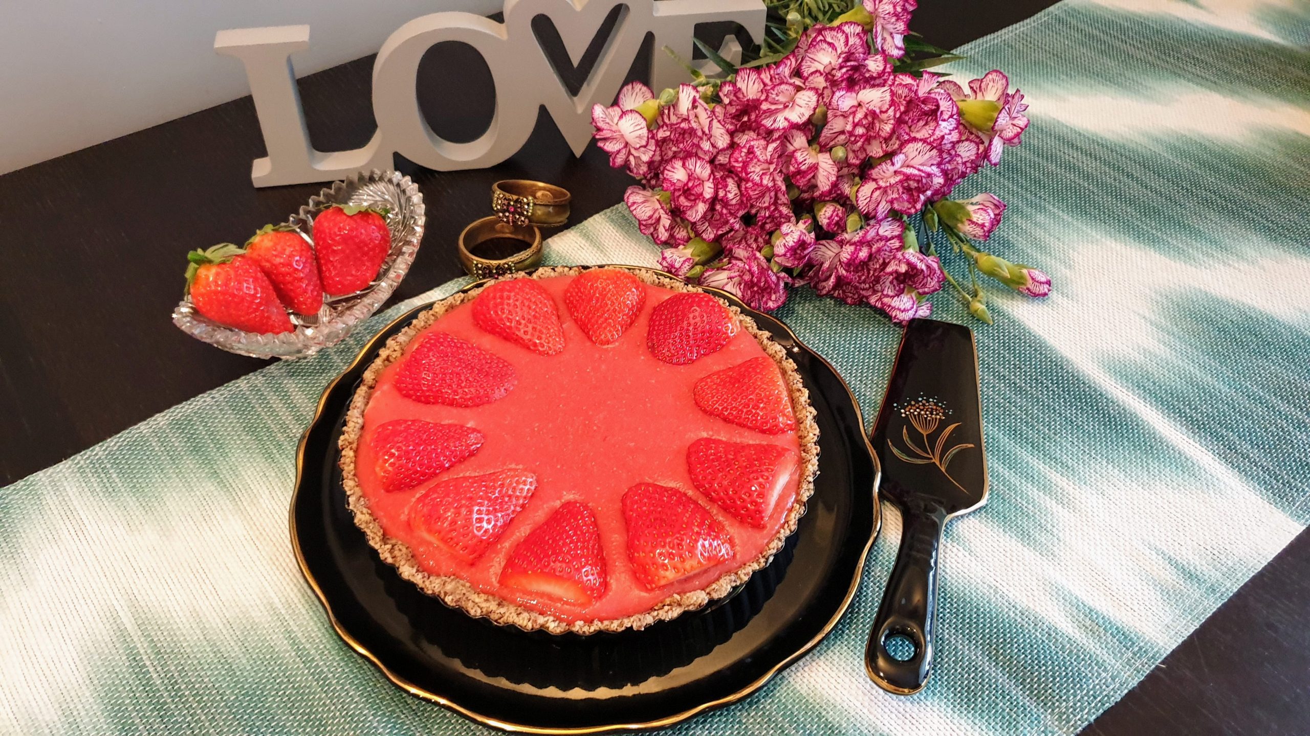 Visszatesszük a hűtűbe, hűlés után félbevágott eperrel díszítjük.