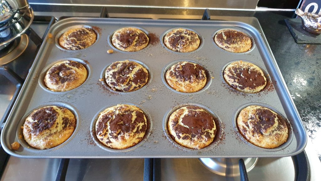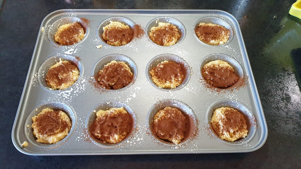Fogunk egy kiskanalat és beletesszük kanalazzuk a formába. A tetejét kicsit elegyengettem, majd kicsi szíta segítségével megszórjuk kakaóporal.