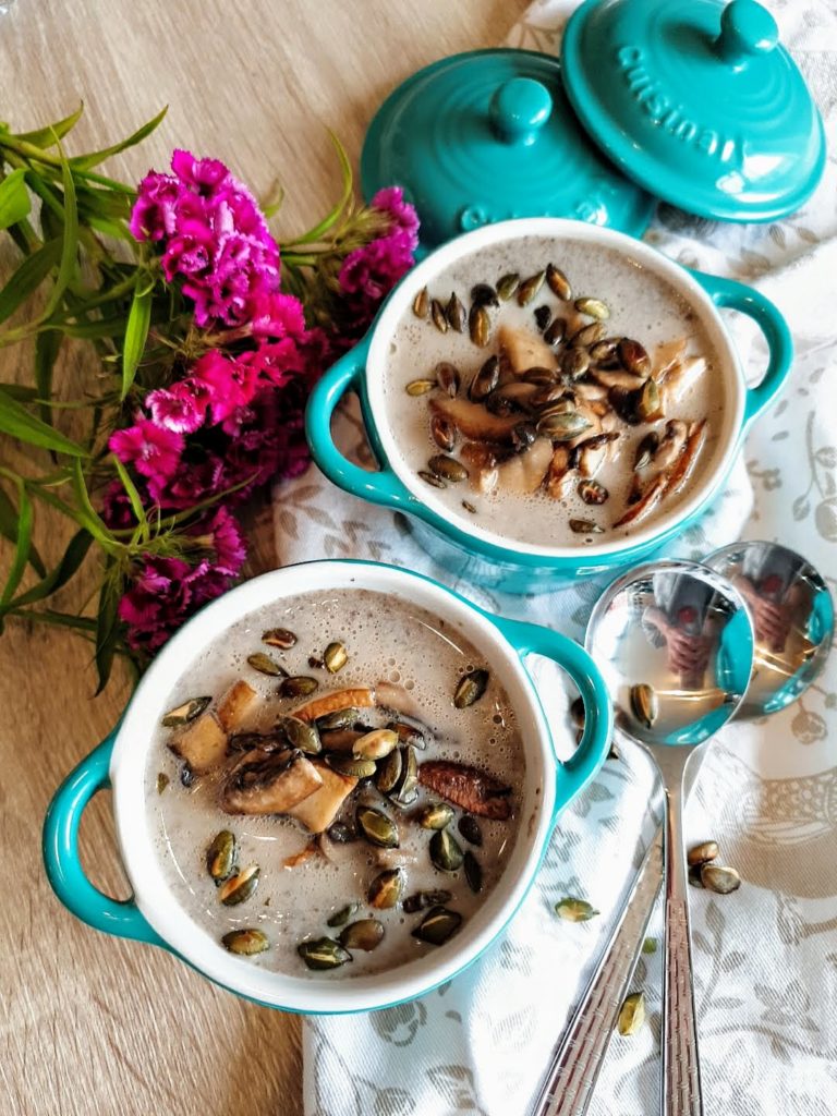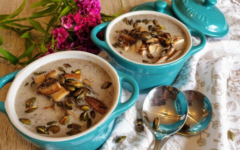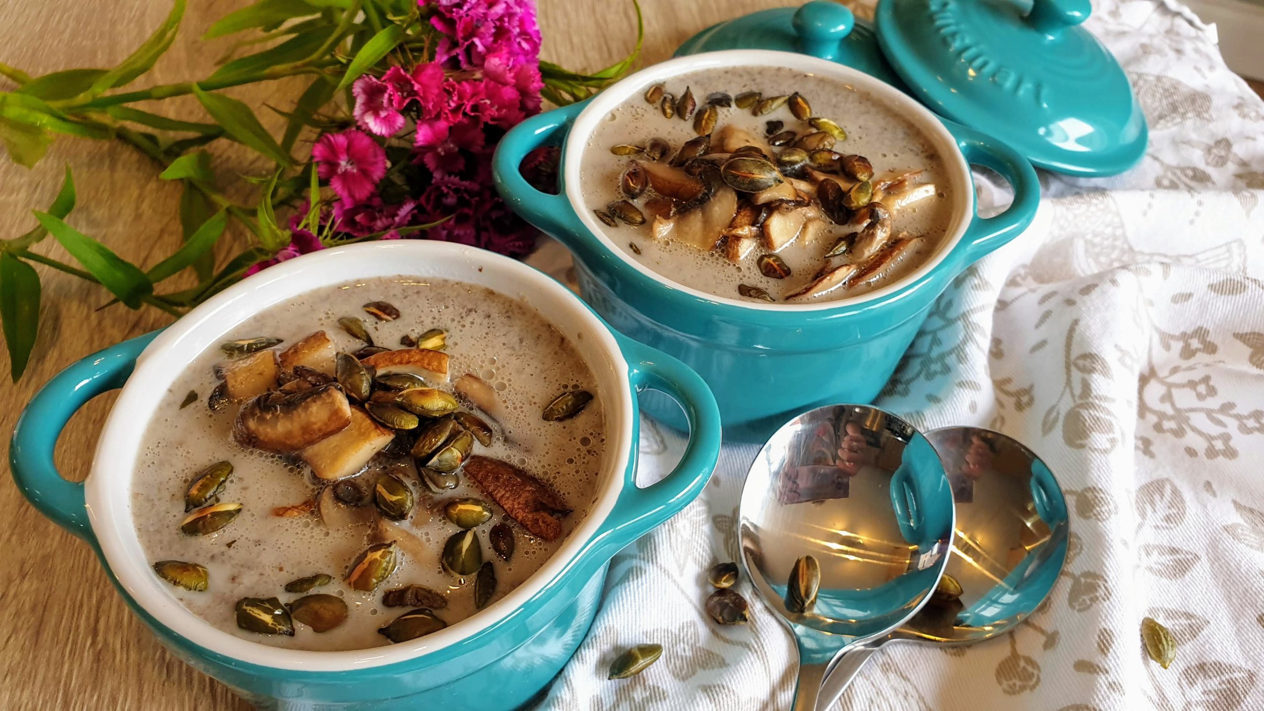 Tálaláskor a levesnek a tetejére teszek a párolt gombából és a tökmagból.
