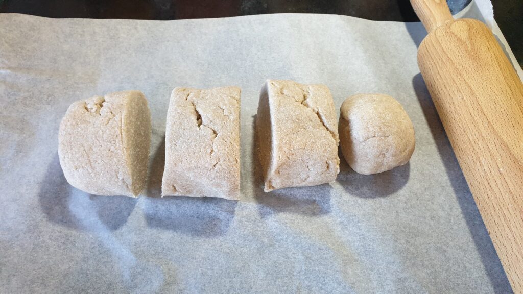 Két sütőpapír között kb. férfitenyér nagyságura kinyújtjuk, laposra, ne legyen vastag, kb. fél miniméteres legyen.