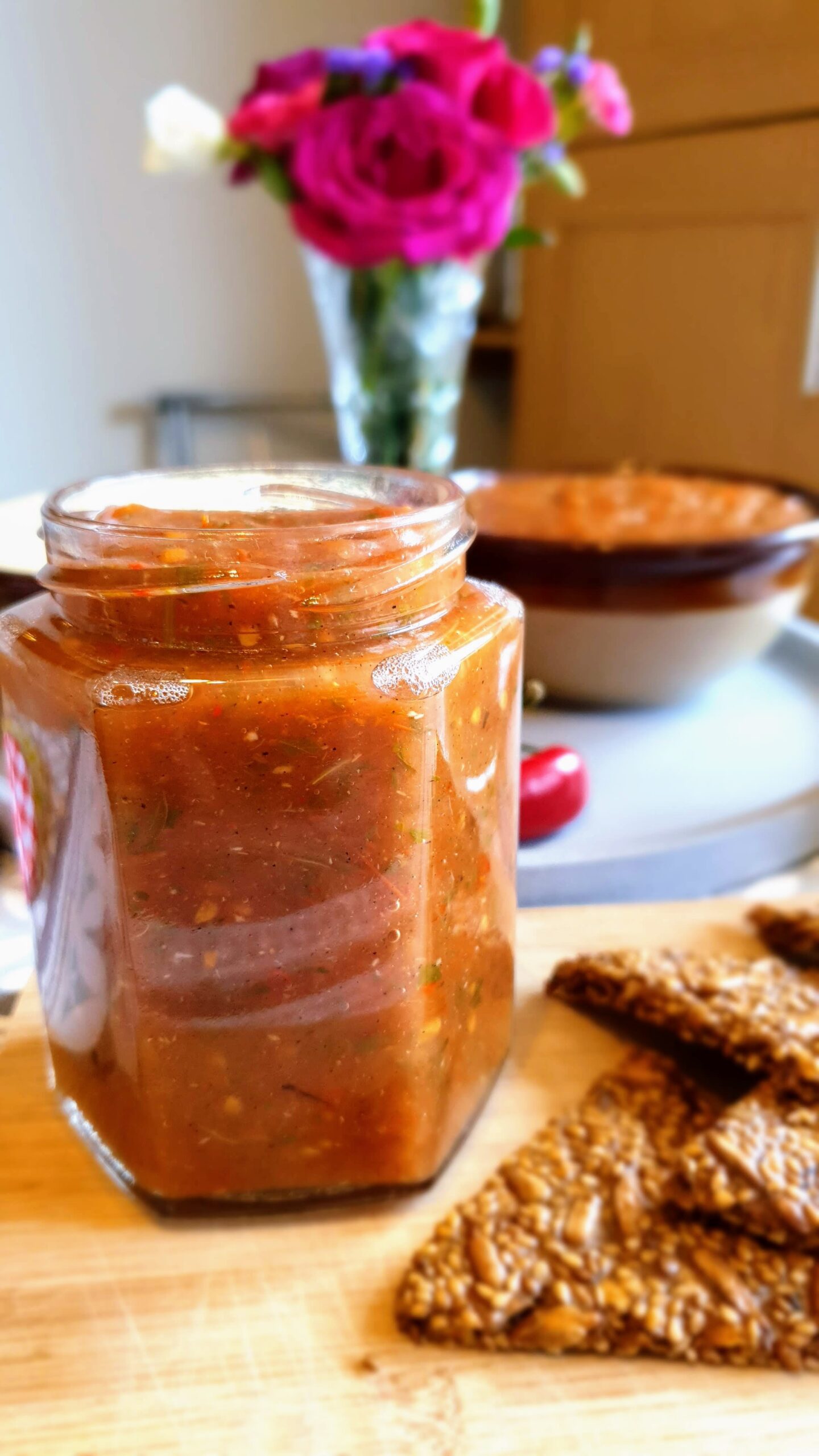 A paradicsomot, chilipaprikát, hagymát, foghagymát lapos tepsibe rakjuk és 200 fokon megsütjük őket, addig sütöttem amig elkezdett a paprika barnulni és a paradicsom megrepedt.
