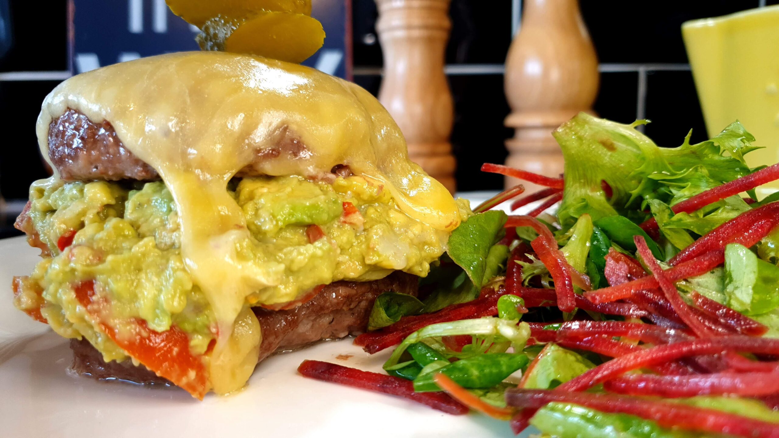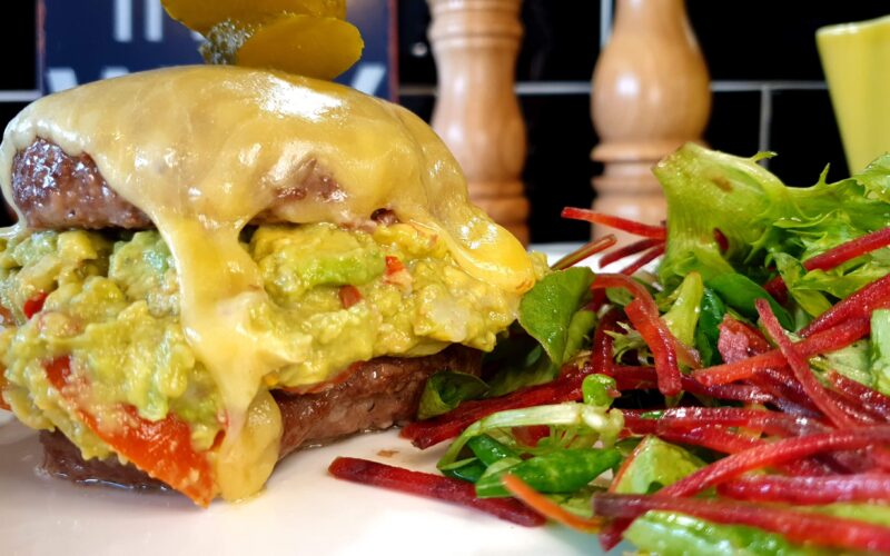 Tálaláskor egy tányérra teszek egy hamburgerhúst arra kanalazók avokádóskrémet, majd egy másik hamburgerhúst teszek a tetejére. Mellé salátát adok köretnek.