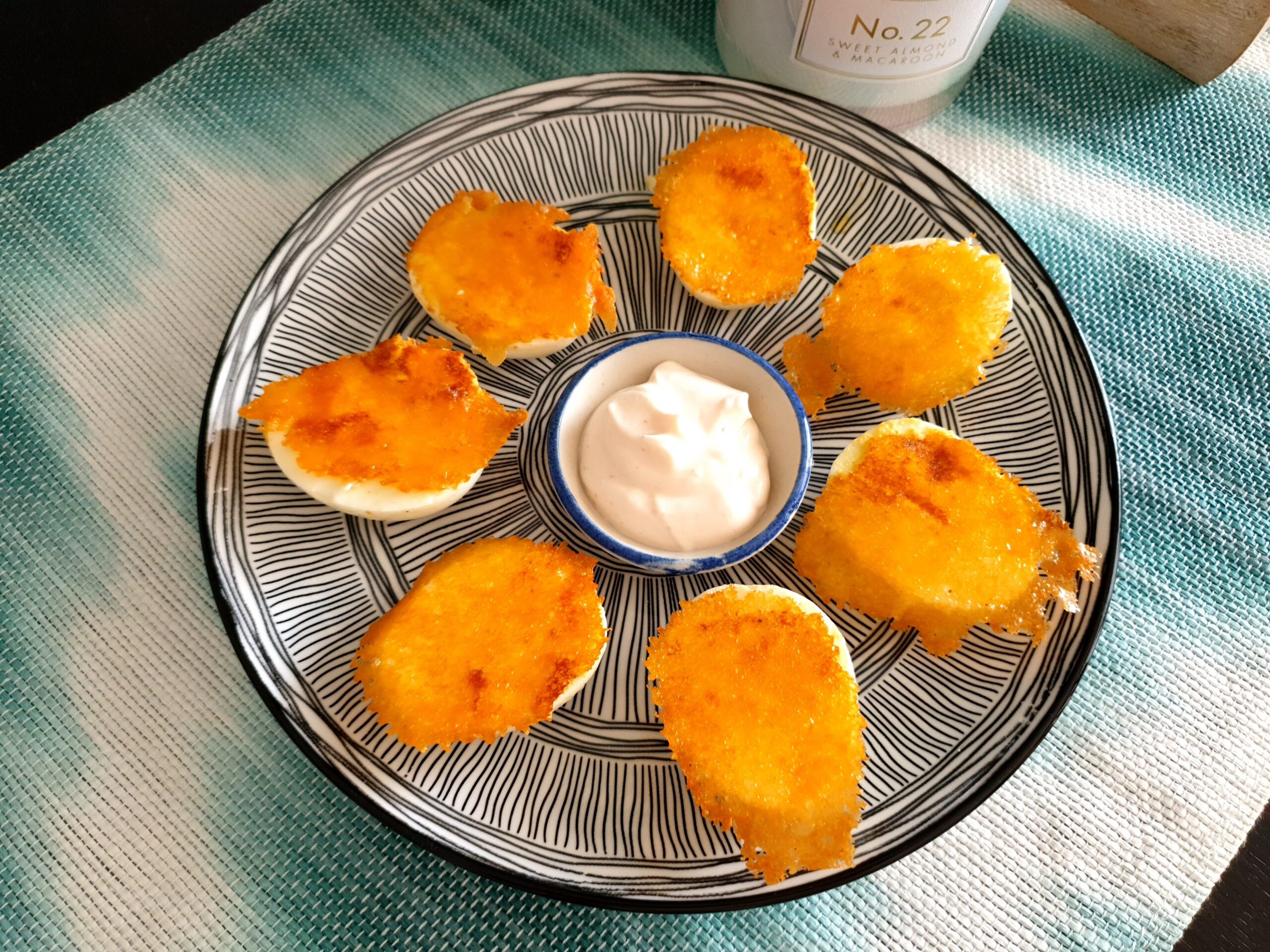 Száraz serpenyőben a sajtos felével lefelé addig sütöm a tojásokat, amíg a sajt elkezd pirulni.