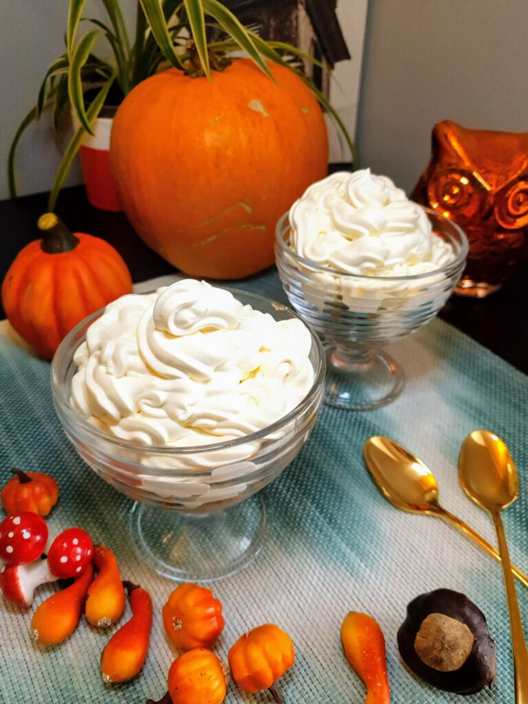 Közben elkészítettem a tejszínt, édesítővel és vaníliával keményhabbá felvertem.