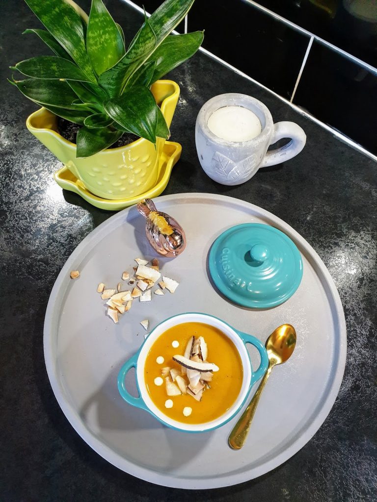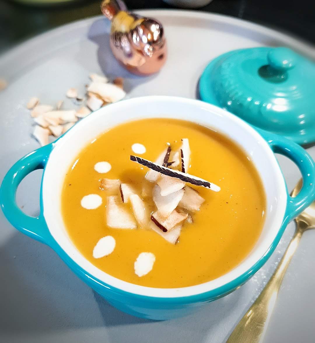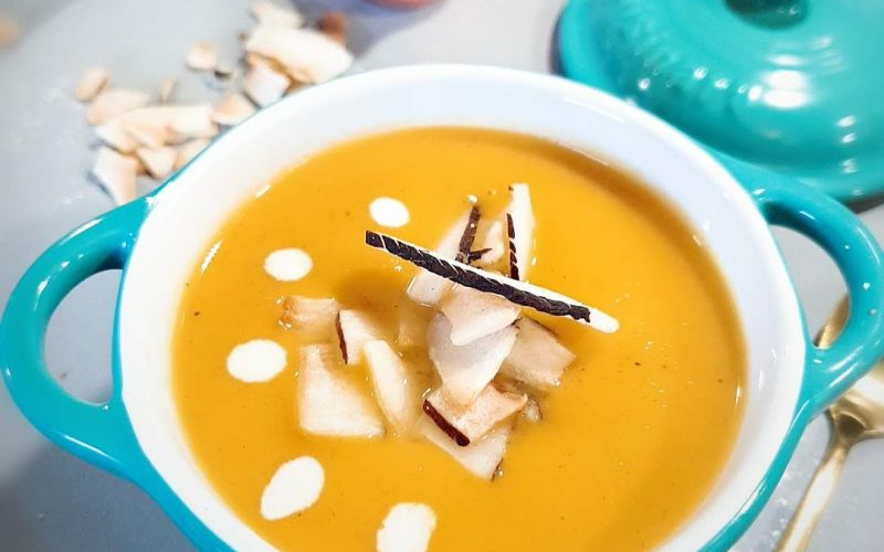 When the soup is cooked blend it with a hand blender / mixer or use a blender until it’s smooth then add the coconut milk and it’s ready.