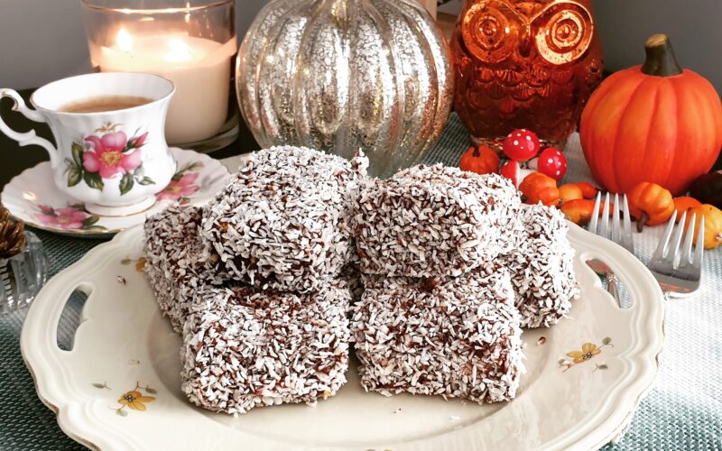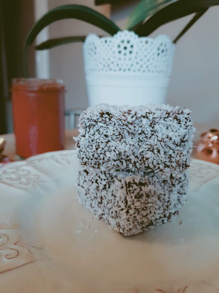 Grease the pastry with the chocolate and dip the sides in shredded coconut.