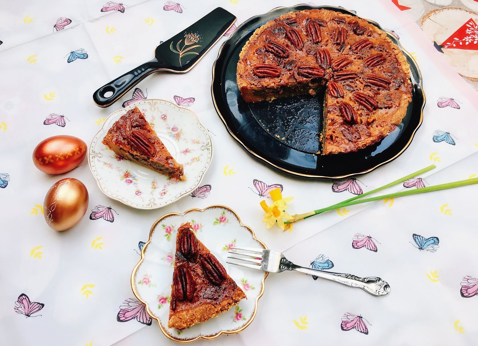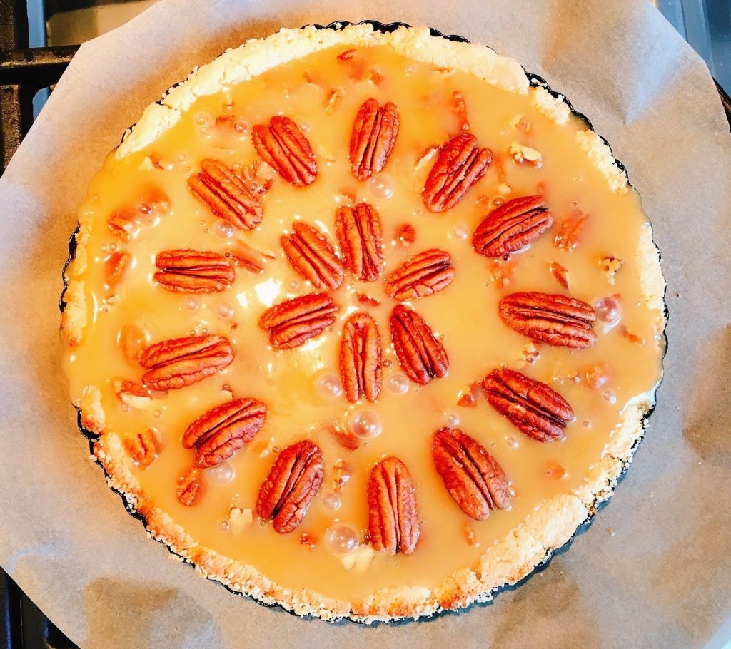 Cut the 2 cups pecan to small pieces and put it on the pastry and add to the caramel sauce. Decorate the top with the whole pecans.