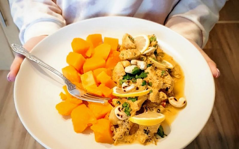 Peel the butternut squash, take out the seeds, and cut it into small pieces. Cook in a pan until soft for 20-25 minutes, add salt while cooking.