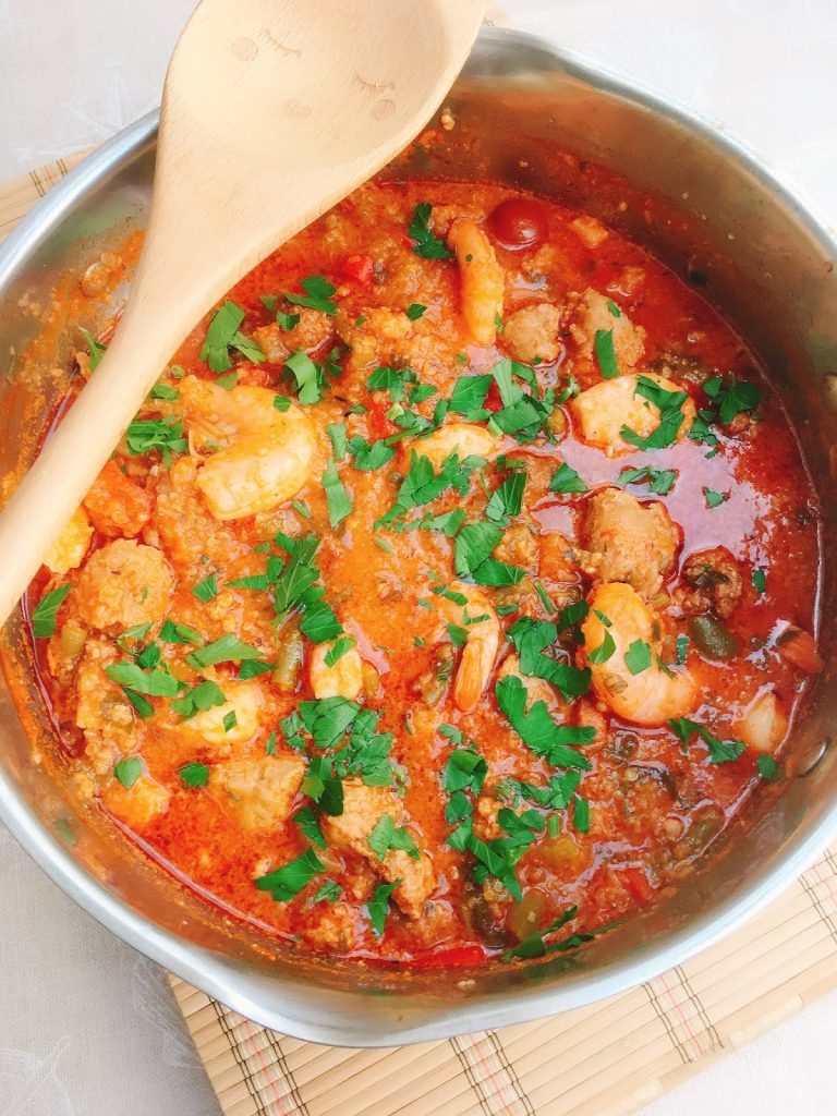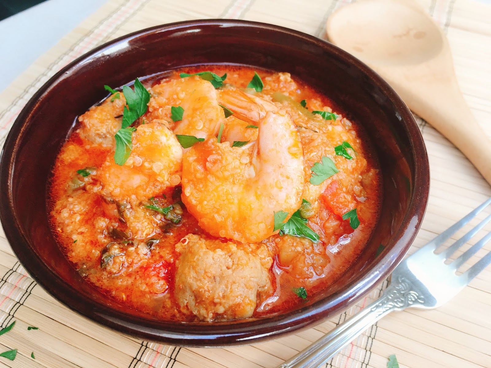 After another half an hour add the rest if the parsley and the frozen shrimps.