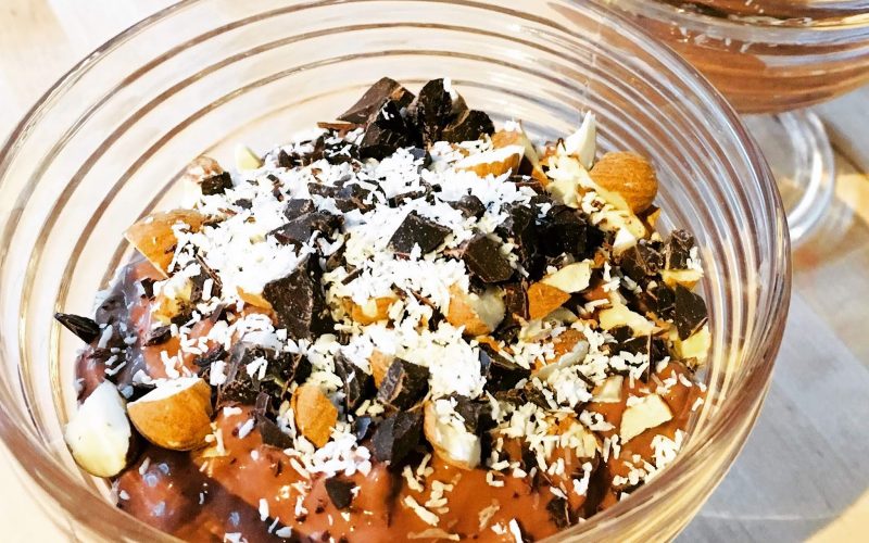 Before serving sprinkle the top with cut almonds, dark chocolate, and desiccated coconut.