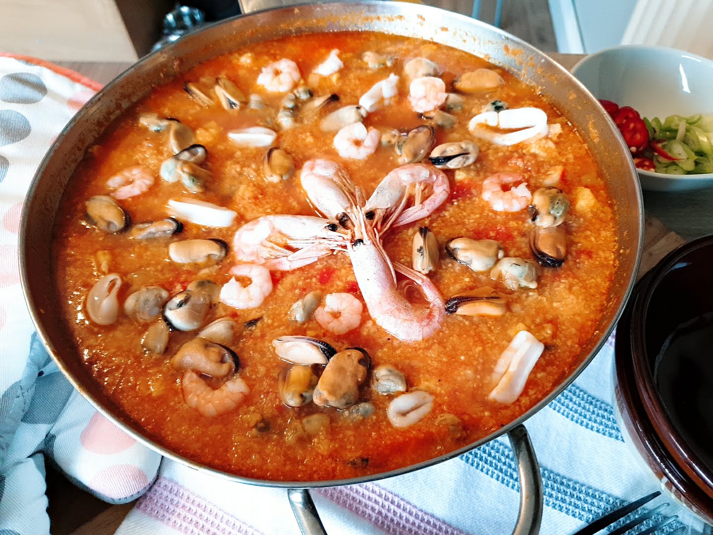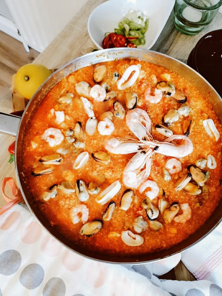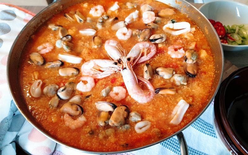 When it’s cooked add the sea food and cook in the oven for 10 minutes on 150 degrees Celcius.