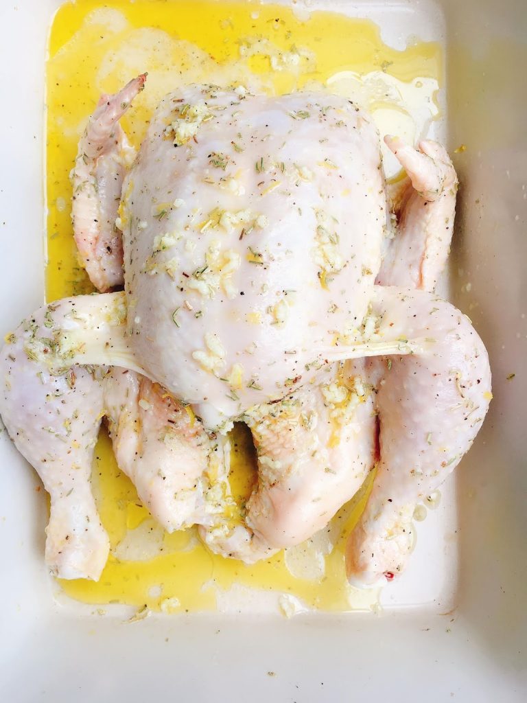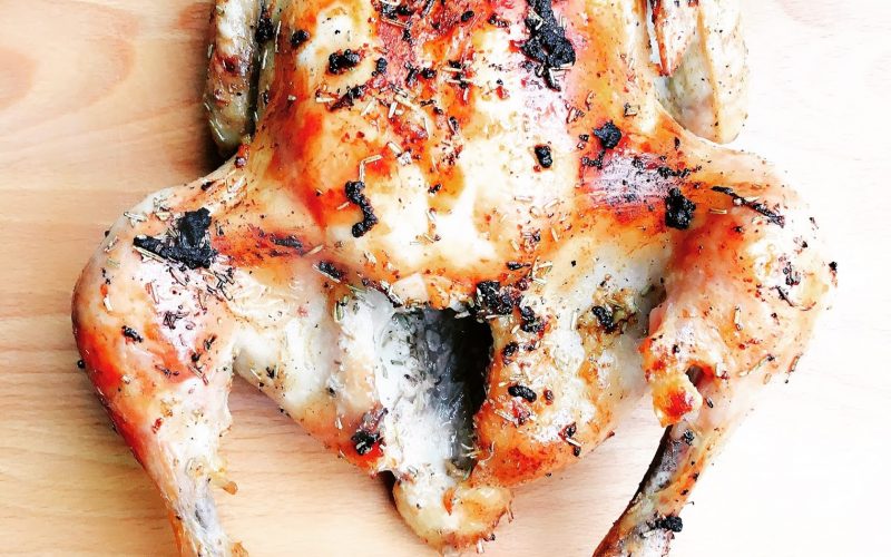 Cover the chicken with wet baking paper and cook in the oven for an hour on 200 degrees Celcius.