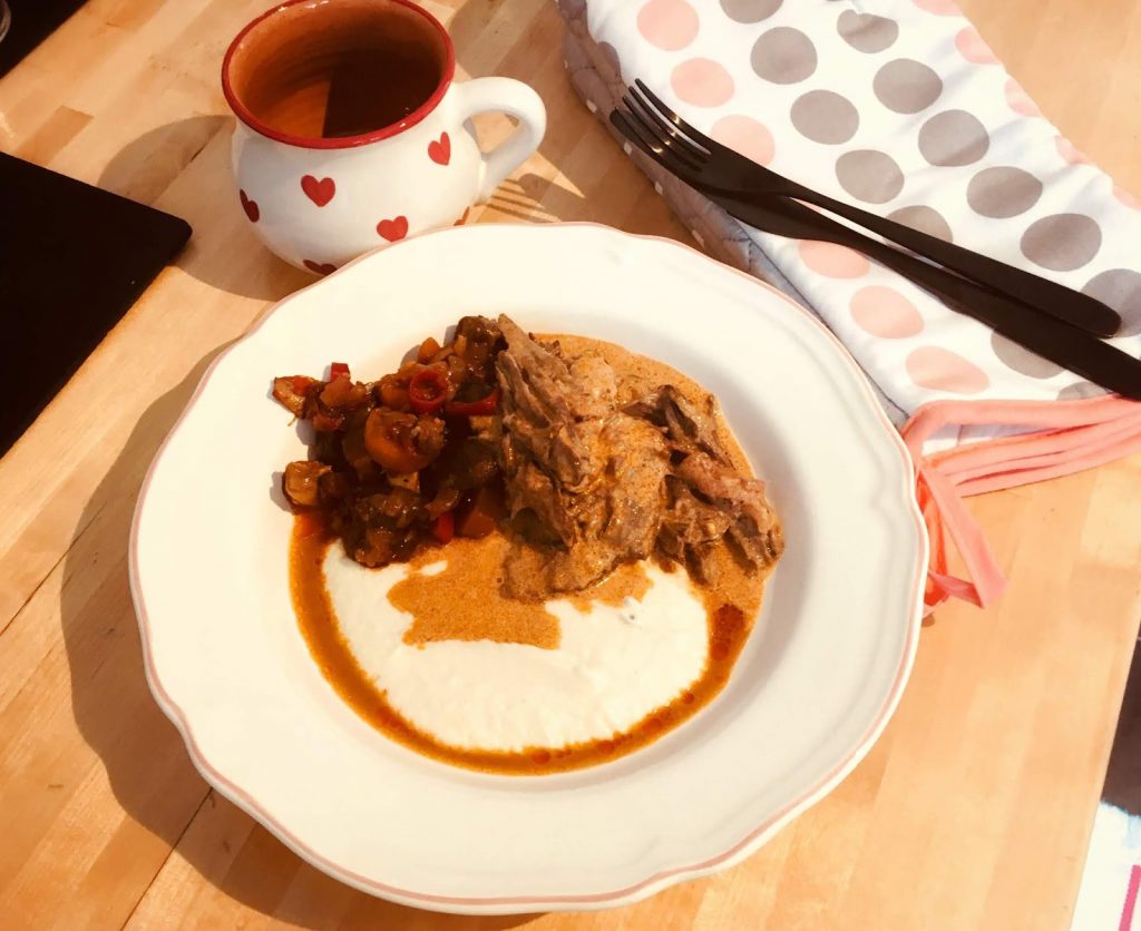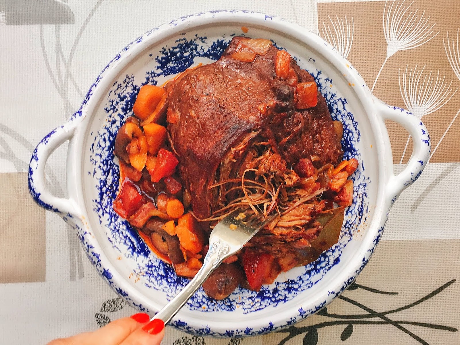 Cut the meat with a fork and pour the gravy on it.