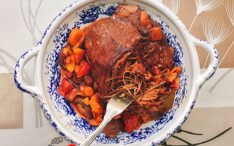 Cover it and cook it in the oven for 4 hours at 150 degrees Celcius.